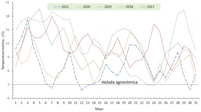Al analizar el promedio de la red, se detectaron 4 días donde la temperatura mínima indicaba la presencia de heladas agronómicas (temperatura igual o inferior a 3 °C, medida al abrigo meteorológico y a una altura de 1,5 m, lo cual supone una temperatura de 0 °C a nivel del suelo). A excepción de mayo del 2018 donde hubo dos días con heladas agronómicas, en el resto de los años la temperatura mínima no tuvo descensos tan importantes (Figura 1).