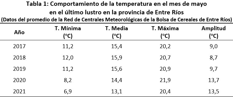 En base a los registros climáticos provenientes de la red de centrales meteorológicas automáticas de la Bolsa de Cereales de Entre Ríos se analizó el comportamiento de la temperatura en el mes de mayo versus los registros de los últimos cuatro años (ver Tabla 1).