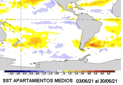 En el mapa se ven dos situaciones interesantes. La primera bastante obvia que es la retracción de la anomalía fría sobre el Pacifico Ecuatorial central, notándose sobre esta cuenca algunos enfriamientos residuales, no asociados ya a un patrón La Niña. El otro punto a destacar, es la prevalencia de la corriente cálida de Brasil sobre la fría de Malvinas, lo cual deviene en un desvío positivo de las temperaturas superficiales del mar Argentino. Esto puede tener injerencia tanto como moderador de las entradas de aire frío desde el sudeste, como proveedor de mayor humedad para el núcleo triguero del sur. Con el Pacifico sur, normal o ligeramente cálido, solo las irrupciones de aire polar estarían en condiciones de provocar enfriamientos rigurosos. Por lo general las irrupciones directas, en un eje sur-norte, desde la península antártica, son las menos frecuentes.
