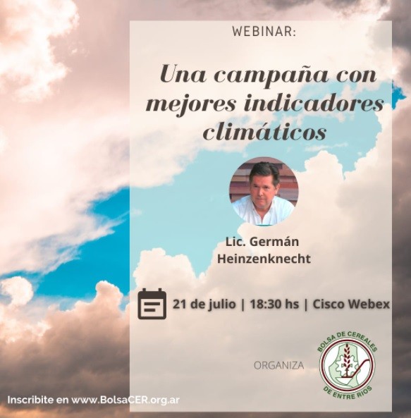 La Bolsa de Cereales de Entre Ríos invita a participar del Webinar sobre perspectiva climática, denominado «Una campaña con mejores indicadores climáticos», a cargo del Lic. Germán Heinzenknecht.