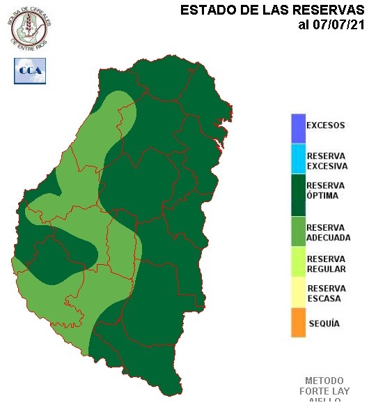 Como podemos ver, las reservas óptimas son las que prevalecen a gran escala en el territorio entrerriano. Los lotes sembrados con fino potencialmente se ven favorecidos por esta buena disponibilidad de humedad y no son malos para su desarrollo los fríos que se han observado. Las condiciones meteorológicas vienen favoreciendo particularmente a la provincia de ER, donde sin que las lluvias hayan sido voluminosas, promueven recargas ocasionales que permiten que los cultivos evolucione sin limitantes hídricas superficiales. Es difícil, por el momento, ver lotes implantados que muestren señales de demanda hídrica.