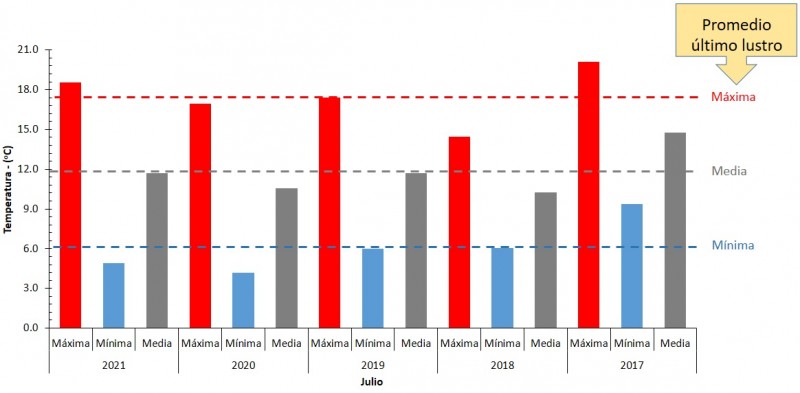 En una primera conclusión podemos afirmar que el mes de julio del año 2020 fue el más frio, ya que el promedio de las temperaturas máximas, mínimas y medias fueron inferiores al promedio del último lustro. Un pequeño escalón más abajo se posiciona el año 2021.