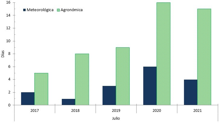En la Figura 2 se muestra la cantidad de días con heladas meteorologías y agronómicas en los últimos cinco años para el mes de julio en el promedio de la red de centrales.