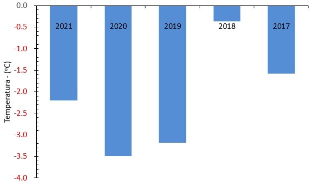 El año 2020 totalizó seis días con heladas meteorológicas versus cuatro del año 2021. Con respecto a la cantidad de días con heladas agronómicas el año 2020 tuvo 16 mientras que el 2021 fue de 15.