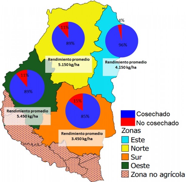 En la Figura 4 se muestra el grado de avance y el rendimiento promedio por zonas en la provincia de Entre Ríos.