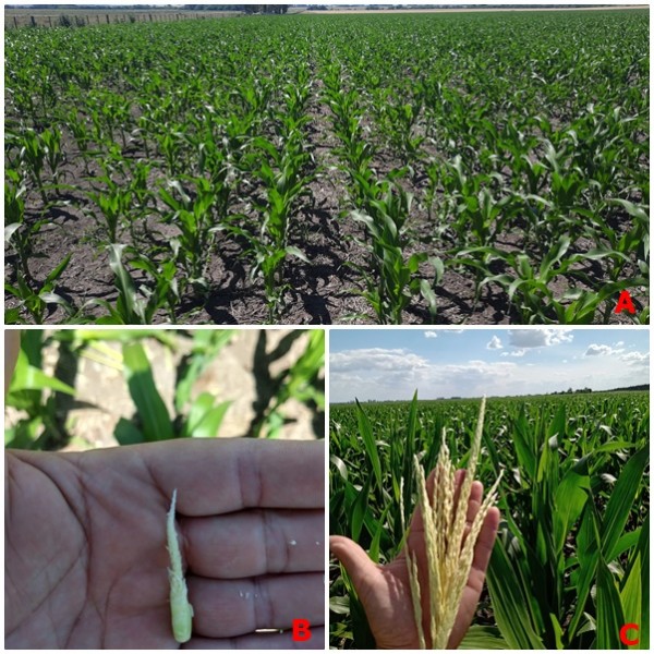El cultivo de maíz en Entre Ríos se ubica en la etapa vegetativa, desde V5 a V9 (9 hojas desplegadas) y los primeros lotes en etapa reproductiva Vt (panojamiento). La condición del cultivo se presenta de la siguiente manera: