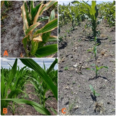 1. En los lugares donde las precipitaciones fueron escasas se observa acartuchamiento de hojas y baja tasa de crecimiento (plantas de poca altura).