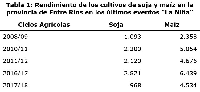 En la Tabla 1 se muestran los rendimientos promedios provinciales en la provincia de Entre Ríos para los cultivos de soja y maíz en los ciclos en los cuales hubo un evento “La Niña”.