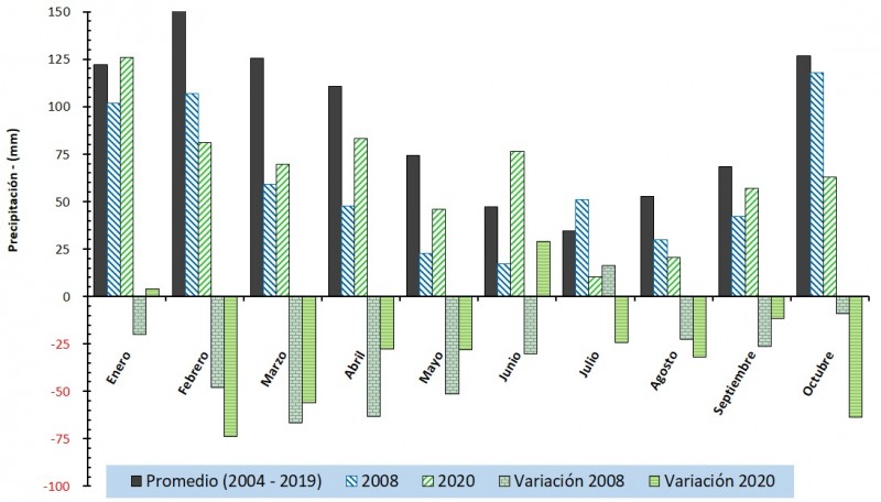 En la Figura 3 se muestra la distribución de la precipitación acumulada de enero a octubre en el año 2008 y 2020.