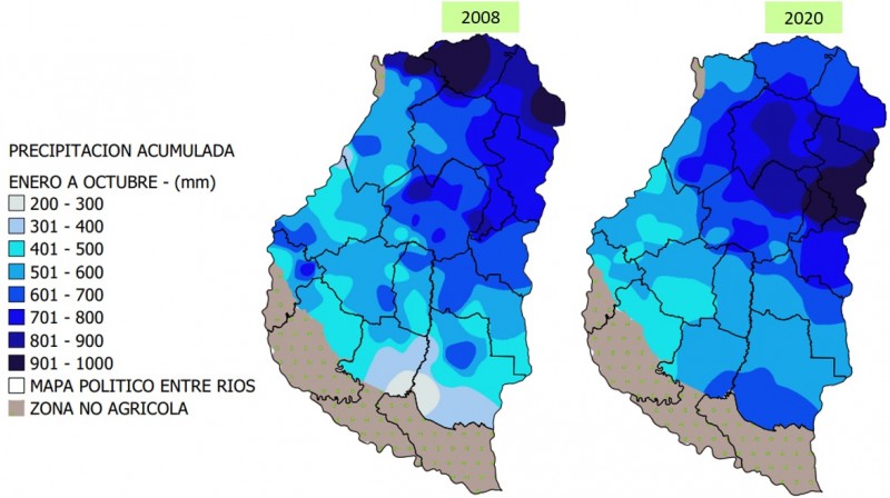 La precipitación promedio acumulada en Entre Ríos desde enero a octubre en el año 2008 fue de 600 mm, con una caída del 25 % (200 mm) con respecto al promedio que es de 800 mm.