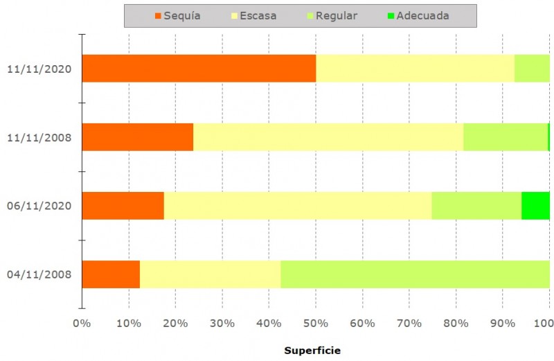 Este hecho, asociado a las escasas posibilidades de lluvias abundantes en el corto de plazo, proyecta una clara expansión del área de sequía.