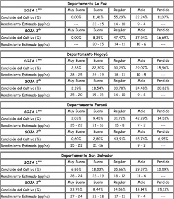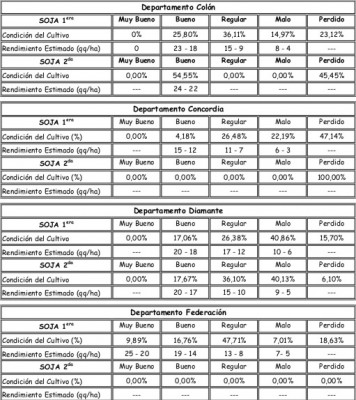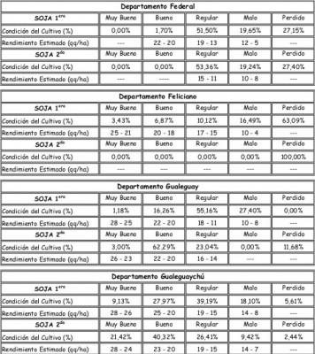 En lo que respecta al rendimiento promedio provincial esperado en Entre Ríos, el mismo se ubicaría alrededor de 1.320 kg/ha, proyectándose una producción que se aproximaría a las 1.329.000 toneladas; lo que indicaría una caída en la producción del 55%, si se las compara con las 2.979.275 tn de la campaña anterior.