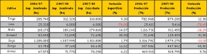 El siguiente cuadro muestra las cifras finales de los cultivos de Trigo, Lino, Maíz, Girasol, Soja, Sorgo y Arroz para la Campaña 2007-08 en Entre Ríos.
