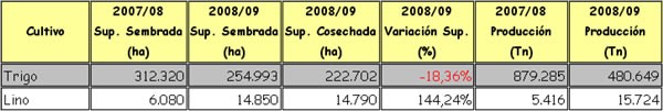El siguiente cuadro compara los datos estadísticos finales de trigo y lino de las dos últimas campañas agrícolas en Entre Ríos.