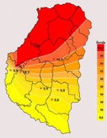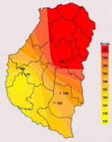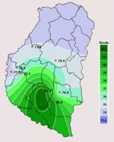 La distribución de precipitaciones que muestra el mapa presenta acumulados mucho más importantes que los previstos. El sistema de mal tiempo que afectó la provincia entre viernes y sábado dejó máximos pluviales muy destacados como los observados en localidades del departamento La Paz, donde llegaron a sumarse hasta 150 milímetros. Se destaca principalmente la posición de estos máximos ya que en todo caso se los esperaba más hacia el sur, donde igualmente se han registrado lluvias copiosas. El centro sur de Tala y el este de Uruguay y Colon han sido los sectores menos provistos por este evento.