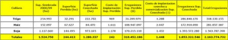 Con los datos brindados por la extensa Red de Colaboradores del SIBER se realizó la estimación de pérdidas económicas de los cultivos de Trigo, Maíz y Soja en la Campaña 2008/09 para la provincia de Entre Ríos.
