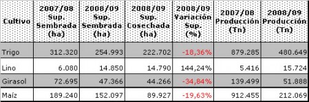 El siguiente cuadro compara los datos estadísticos finales de trigo, lino, girasol y maíz de las dos últimas campañas agrícolas en Entre Ríos.