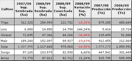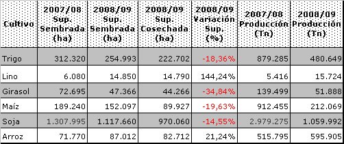 El siguiente cuadro compara los datos estadísticos finales de trigo, lino, girasol, maíz, soja, sorgo y arroz de las últimas campañas agrícolas en Entre Ríos.