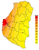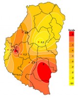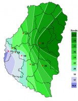 Cambiando del domingo para el lunes y durante las primeras horas de aquella jornada, se observaron precipitaciones en vastos sectores del territorio entrerriano. Prácticamente la totalidad de la provincia ha recibido lluvias aunque queda claro en la distribución que muestra el mapa, que las zonas trigueras del sudoeste no han sido muy beneficiadas. En este sector han predominado registros del orden de los 5 milímetros o inferiores, en algunos casos solo algunas lloviznas de mínimo registro.