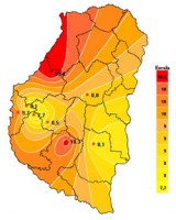Sobre el norte del territorio se observa una franja donde se ubican los máximos pluviales de este evento y su zona de influencia. Esta franja se extiende desde La Paz a Concordia y en algunas localidades se superaron los 50 milímetros. El mapa revela la disposición que tuvieron las principales celdas de tormenta o en todo caso las nubes que alcanzaron un importante desarrollo vertical. El mayor nivel de condensación potencia la eficiencia de los sistemas precipitantes.