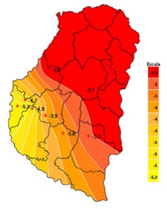 Otro período de frío intenso sobre toda la provincia, con una baja amplitud térmica entre las mínimas diarias, que fueron inferiores a los 5ºC bajo cero y las máximas, que si bien alcanzaron durante algún momento los 17ºC, estuvieron mayormente bastante por debajo de esa marca, así lo demuestra la temperatura media diaria que solo llegó superar por escaso margen los 6ºC. Esta baja amplitud térmica y las temperaturas bajo cero causaron la constante presencia de heladas, de mayor o menor intensidad, en toda la región.