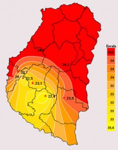 Periodo prácticamente sin cambios respecto del anterior. Si bien las temperaturas mínimas tuvieron un leve descenso y llegaron a los 2ºC bajo cero, esto fue solo durante un día de los siete considerados, mientras que en los demás las mismas siempre estuvieron por encima de 0ºC. Por su parte las máximas superaron en un par de grados a las registradas en el informe anterior, hasta alcanzar los 24ºC, marca poco habitual para el mes de agosto.