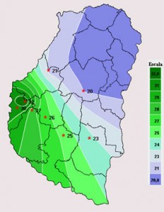 La solución del balance hídrico para las 9 hs de hoy muestra un retroceso de las reservas como una consecuencia lógica después de otra semana sin precipitaciones. De todas maneras el contenido de agua útil en el primer metro de suelo se mantiene en niveles adecuados para una pradera, lo cual también es favorable para los cultivos de invierno implantados.