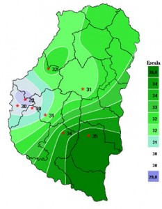 A pesar de que se está observando una fuerte circulación del sector norte, las condiciones meteorológicas dominantes son estables. Esto se debe al intenso eje de alta presión que persiste en altura promoviendo movimientos descendentes, secando y calentando la masa de aire en superficie. Entre sábado y domingo se espera que la zona de alta presión se desplace hacia el este, lo cual en principio promovería un aumento de la inestabilidad. La masa de aire residente aumentaría su potencial para producir lluvias con el acercamiento de una zona frontal. Es factible que esta actividad se concrete entre lunes y martes.