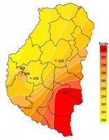 El mapa permite diferenciar con claridad que las lluvias no fueron tan abundantes del centro para el sur de la provincia. Incluso se aprecia un extendido mínimo en el sur del departamento Nogoyá. En general la zona triguera del sudoeste ha quedado alejada de las exageradas precipitaciones observadas en el norte. En muchos sectores del norte provincial las lluvias normales (aprox. 140mm) de noviembre han sido casi triplicadas, lo cual contrasta con algunos sectores del sudoeste donde recién en las próximas jornadas se alcanzarían las lluvias normales.