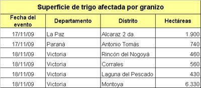 En la siguiente tabla se presentan las hectáreas de trigo afectadas por el granizo, si bien todavía falta establecer el nivel de daño acaecido en cada caso las primeras estimaciones indicarían que la gran mayoría se ubicarían entre el 70% y el 100%; cabe mencionar que además se reportaron daños en lotes de maíz, sorgo, cebada y soja.