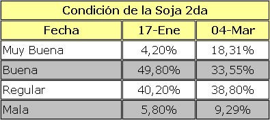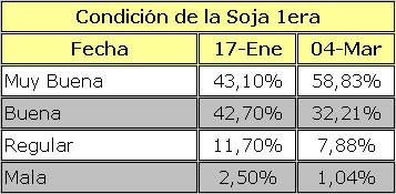 De la consulta realizada a la extensa Red de Colaboradores para determinar la condición de la soja de primera y de segunda, surge que en el último mes y medio se ha producido una mejoría general del cultivo con respecto a la situación que presentaba el 17 de enero, fecha en que se realizó la primera estimación de estado de la soja.