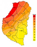 Durante la ultima semana las condiciones inestables debidas a la formación de un sistema de baja presión sobre el sudeste de la provincia permitieron por un lado que se produjeran algunas lluvias de moderada intensidad y por el otro un importante aumento de las temperaturas máximas que superaron los 32ºC, muy por encima de los 28ºC de la semana anterior. Las mínimas no siguieron la misma tendencia pues se mantuvieron alrededor de los 9ºC, casi sin variaciones respecto del periodo anterior. Este escenario dio como resultado una media diaria de aproximadamente 18ºC acorde a los valores históricos del mes en curso.