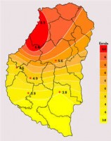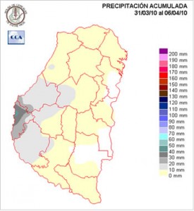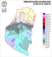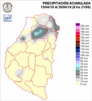 Entre el lunes 19 y martes 20 de abril se registró la caída de granizo en forma aleatoria, la cual ingresó con una dirección suroeste – noreste, iniciándo entre el norte del departamento Paraná y el sur de La Paz.