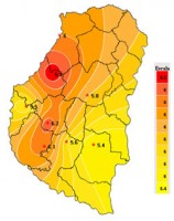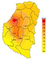 El mapa presenta excesos en sectores que arrastran reservas muy altas, sumándose el centro este de la provincia a partir de precipitaciones  superiores a los 20 milímetros. En las vecindades de Hasenkamp,  aparece un sector reducido que responde con suelos saturados a un registro pluvial de 28 mm.
