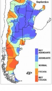 Luego de las lluvias de finales de septiembre el comportamiento pluvial comenzó a experimentar importantes retrocesos en vasto sectores del país. Una excepción en sentido contrario se observó en SL, centro sur de CB, sur de SF y parte del norte de BA. Si bien es posible que el efecto Niña comience a notarse, aparecen causas dinámicas vinculadas al potencial desarrollo de sistemas precipitantes que pueden observarse al comparar el mes de septiembre con lo que va de octubre. En primer lugar presentamos la situación del mes de septiembre y luego el cambio del mes de octubre.
