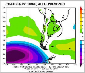 El mes de octubre se caracteriza por su marcado aumento en los acumulados de lluvia. Queda claro que si la situación dinámica de septiembre se hubiese sostenido, el paso del mes de octubre sería más cercano al normal. Sin embargo, solo en el centro oeste de la región pampeana se vienen sumando lluvias que tenderán a satisfacer la estadística, predominando por el momento las deficiencias pluviales en vastas zonas agrícolas del país. Justamente, octubre ha mostrado un cambio en la presión superficial que genera condiciones desfavorables para el normal avance de los frentes o en todo caso cuando estos transitan el este del país encuentran zonas estructuralmente estables que inhiben los desarrollos nubosos de importancia, lo cual se traduce en una magra oferta de agua. Obsérvese la anomalía de presión en superficie que caracteriza lo que va de octubre.