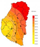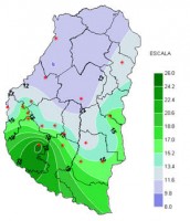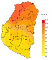 El mapa que representa el balance hídrico a las 9 hs de ayer, responde a lo que anticipabamos en el informe de la semana pasada. Es decir, la disponibilidad de agua retrocede de manera mucho más rápida en esta época del año y en consecuencia este extenso período libre de precipitaciones o con lluvias por debajo de los valores normales no alcanza para compensar las pérdidas. De esta manera el primer metro de suelo de la mayor parte del territorio entrerriano refleja un importante desecamiento, que llega a niveles preocupantes en los departamentos del norte.