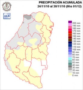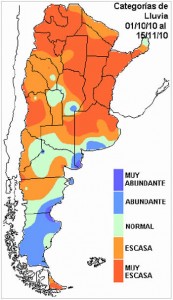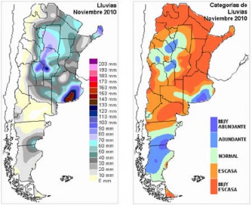 La categorización de las precipitaciones a partir de la comparación de los registros observados con la estadística mensual del mes de noviembre (1973-2009), resume con claridad la gravedad de la situación, con un fuerte predominio de la categoría muy escasa en áreas vitales para la producción de la oleaginosa. El NEA no ha escapado a esta situación, también proyectada hacia el oeste sobre el NOA, donde el comienzo de la temporada de precipitaciones viene atrasado. Aparecen comportamientos normales o incluso algunas lluvias abundantes en zonas marginales del oeste, de las que es posible rescatar algunos sectores de Río Cuarto o San Luis. Por otra parte, no llama la atención el desvío positivo que experimentaron las precipitaciones del sudeste de BA, comportamiento que fuimos evaluando en informes precedentes y que por cierto ha resultado muy ventajoso para el trigo de la zona y para las perspectivas de siembra de soja de segunda.