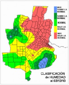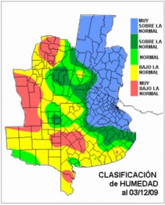 La comparación interanual de la clasificación de humedad se resuelve en una situación prácticamente antagónica. Predominan anomalías positivas en el centro este y noreste, con deficiencias no tan graves en el oeste y el sur. Obsérvese que para principios de diciembre de 2009 el noreste de BA ya clasificaba con humedad muy sobre lo normal. En el resto del mes sobrevendrían las inundaciones coincidentes con el máximo desarrollo del fenómeno de El Niño. Justamente la fase contraria esta dominando el inicio d esta campaña y el impacto en las precipitaciones es prácticamente el contrario. Este indicador de escala planetaria ha sido muy eficiente en las últimas dos campañas como predictor de largo plazo, obviamente a escala regional.
