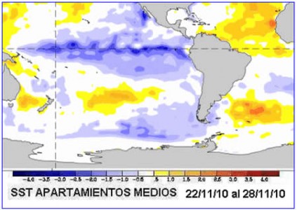 De acuerdo con lo previsto, el evento La Niña ha cerrado el mes de noviembre con promedios de apartamiento negativo cercanos a 1.5°C en el Pacífico Ecuatorial central. El enfriamiento es muy marcado y su impacto es generalizado en vastas zonas del sudeste de Sudamérica. El mapa refleja con claridad todo el corredor frío a lo largo del Ecuador sobre el Pacífico.