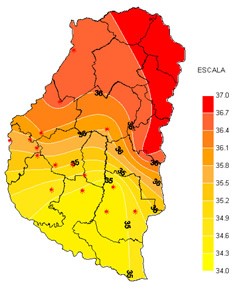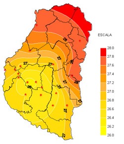 El ingreso de una masa de aire frío ocurrida durante los primeros días del nuevo año provocó precipitaciones y además una ligera baja en las temperaturas máximas, que se mantuvieron en torno a los 37ºC, es decir, por debajo de los valores extremos de 40ºC registrados en el periodo anterior. El caso de las mínimas fue distinto, ya que superaron en casi 2ºC las medidas la semana pasada, manteniéndose entre los 19 y los 20ºC. Este es el motivo por el cual la disminución de las máximas casi no tuvo efecto en la temperatura media diaria que permaneció en 27ºC.