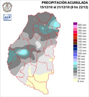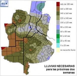 A fines del mes de diciembre la Consultora Climatológica Aplicada (CCA) realizó el siguiente mapa que muestra la demanda de precipitaciones necesarias en las dos primeras semanas de enero si se pretende recuperar los niveles adecuados de humedad en el primer metro de suelo.
