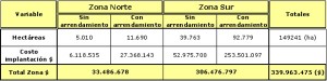 El valor del arrendamiento se consideró: 8 qq/ha de soja para la zona Norte y 10 qq/ha de soja para la zona Sur, a un valor de 140 $/qq (Pizarra Rosario 17/01/2011).