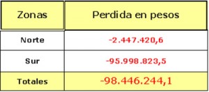 Con lo cual de acuerdo al cuadro habría por el momento una perdida de 98.446.244 $, que deberán afrontar los productores, en el siguiente cuadro discriminado por zona.