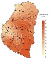El tercer mapa no solo representa la diferencia porcentual entre los dos períodos, sino que también permite ver claramente la distribución espacial del aumento durante la ultima campaña, mostrando las áreas que se vieron mas comprometidas, tanto por la disminución de las lluvias (mostrada en detalle en el informe anterior) como por el incremento de la Radiación Solar Media y por ende de los grados/día acumulados por los cultivos.