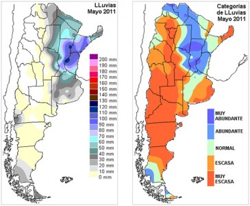 En el mapa que muestra la distribución de lluvias se ve gran parte del este y zonas del centro de Santa Fe, como así también una buena porción de la Mesopotamia con lluvias generosas, las cuales ingresan al noreste de Buenos Aires y pierden presencia hacia el sur. Los principales sistemas precipitantes se concentraron en la segunda quincena del mes, mostrando recurrencia en el centro este de la región pampeana. Las lluvias, por lo contrario, fueron muy escasas en el oeste de la franja mediterránea del país. Mayo, normalmente muestra un retroceso de las precipitaciones en la provincia de Córdoba, por ejemplo, pero generalmente los departamentos del oeste todavía pueden sumar hasta treinta milímetros en este mes. Esto no ha sucedido y claramente se observa que este comportamiento se hace extensivo a las provincias de San Luis y La Pampa, repitiéndose hacia el NOA, donde ya se está ingresando en la época más seca del año.