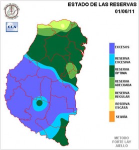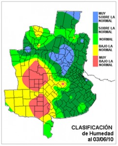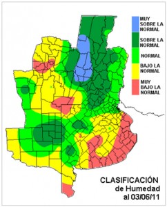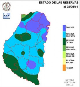 Como es habitual, se analizan las condiciones de humedad actuales mediante la comparación con los valores de reservas normales para la fecha. Los resultados de la comparación se clasifican en categorías, teniendo en cuenta para la estadística la serie de datos 1973 – 2010. El análisis se realiza teniendo en cuenta como cobertura una pastura de consumo permanente a lo largo de todo el año.