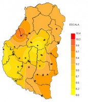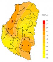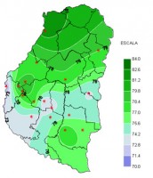 Como decíamos, la permanencia del aire húmedo sobre la provincia, facilitó el desarrollo de una extensa cobertura de nubes bajas y medias que hacia el norte de la provincia y el sur de Corrientes encontraron mejores condiciones para su desarrollo vertical y por lo tanto para potenciar su oferta de agua. Claramente esto se nota en la distribución de las precipitaciones, en efecto, las mismas decrecen desde el noreste hacia el sur, con acumulados mayormente homogéneos en el centro, debilitándose hacia los departamentos del sur. En general sobre la franja central predominan valores de entre 15 y 20 milímetros, quedando algunos sectores con una provisión cercana a los 10 milímetros. Salvo las zonas del norte, incluso 10 milímetros eran innecesarios para la condición de humedad que presentaba la provincia.