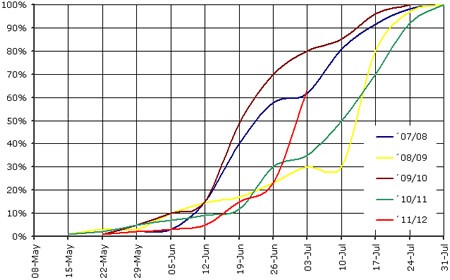 En el Gráfico 1 se presenta la evolución semanal en el progreso en las labores de siembra de trigo para las campañas 2007/08 hasta la 2011/12, claramente puede apreciarse el importante avance que se ha logrado en los últimos 15 días.