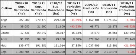 El siguiente cuadro compara los datos estadísticos finales de trigo, lino, girasol, arroz, soja y maíz de las dos últimas campañas agrícolas en Entre Ríos.